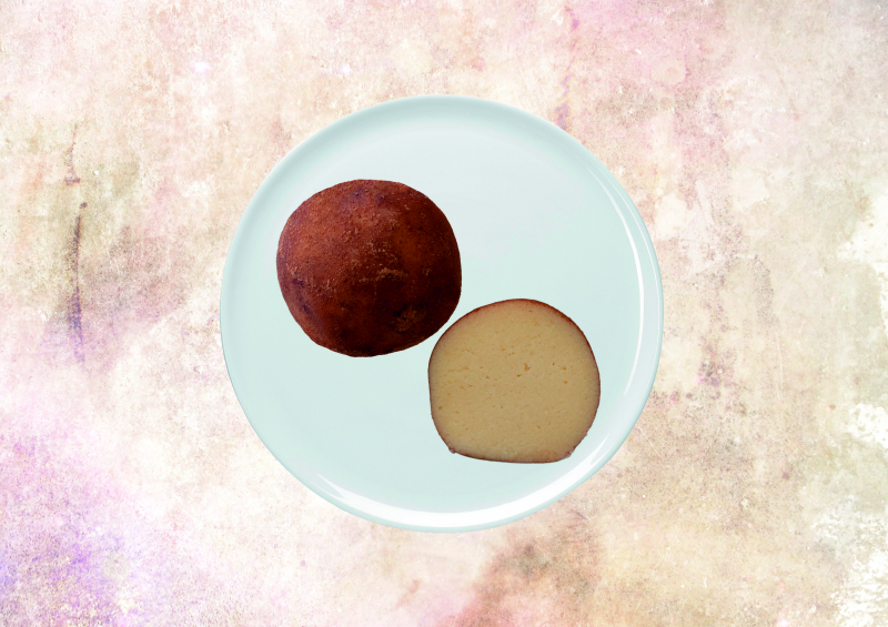Основа пирожного - классический белый бисквит с кремом из сгущенного молока и сливочного масла. Оформлена какао