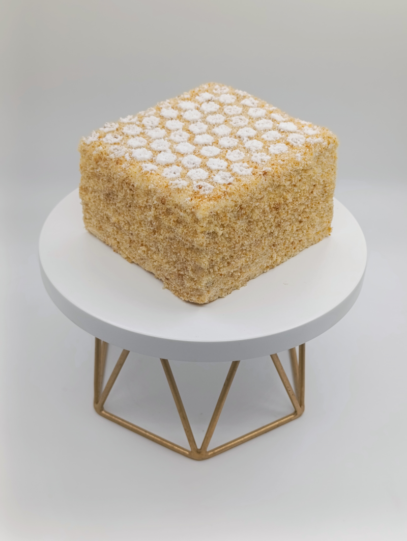 Ароматный многослойный торт. В основе- коржи из медового бисквита. Коржи пропитаны кремом из сметаны и сливочного масла.