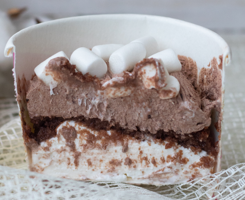 Шоколадный бисквит в виде крошки, пропитан сиропом, в прослойке шоколадный и сметанный крем со сливками, декорирован маршмеллоу.
